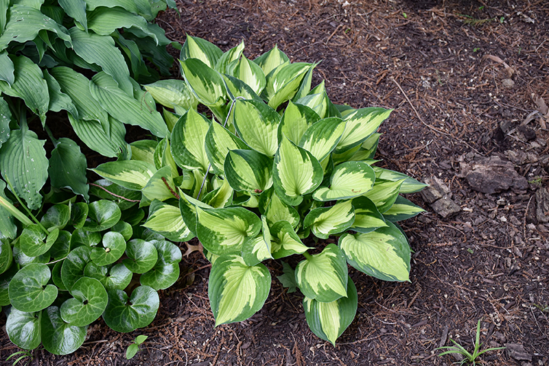 Deep green margins surround creamy white centers in spring that mature to light green then finally dark green in late summer; spikes of pale lavender flowers in mid to late summer; a whirlwind of change in the garden or border
