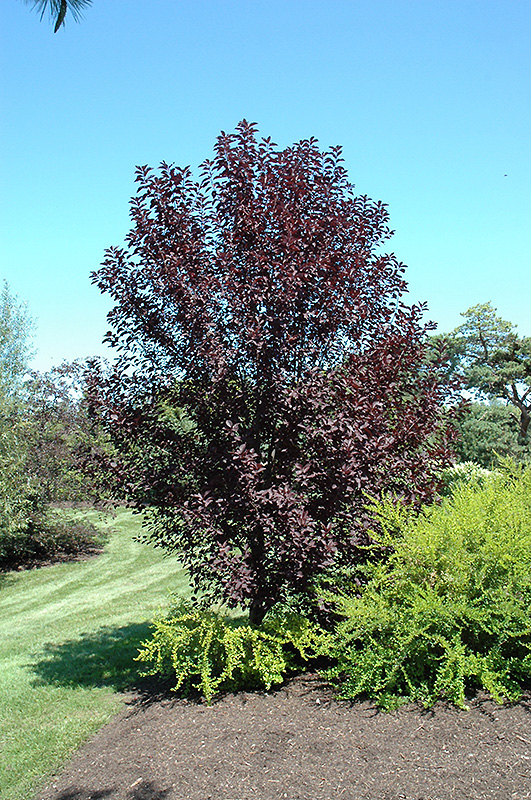 A small color accent tree with deep dark purple foliage from mid-summer onwards and very attractive racemes of white flowers in spring followed by small, astringent black cherries; does not tend to sucker as much, can be susceptible to black knot