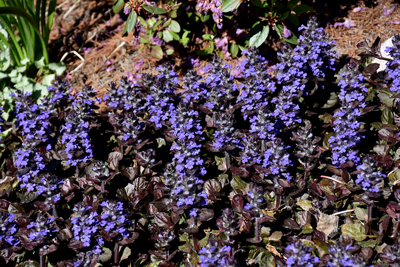 Black Scallop Bugleweed's attractive small crinkled round leaves emerge dark green in spring, turning deep purple in colour the rest of the year on a plant with a spreading habit of growth. It features subtle spikes of blue flowers rising above the foliage from mid spring to early summer.