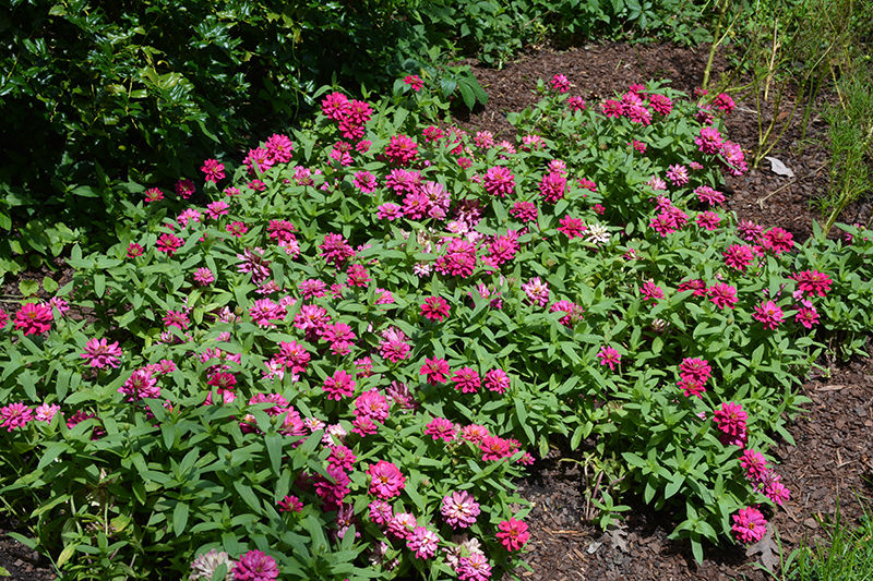 Zahara® Double Cherry Zinnia is an herbaceous annual with an upright spreading habit of growth. Its medium texture blends into the garden, but can always be balanced by a couple of finer or coarser plants for an effective composition.