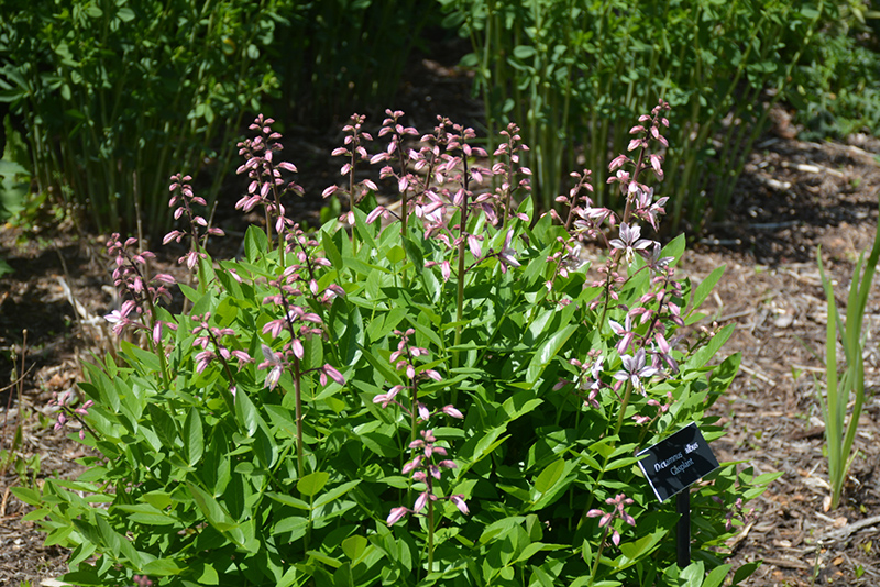 Bushy upright mounded variety with aromatic glossy green leaves, smelling like citrus when bruised, and tall spikes of white flowers with deep purple veining; blooming late spring to early summer, great for borders, beds or fresh-cut arrangements