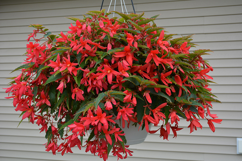 Bossa Nova® Rose Shades Begonia features dainty nodding rose bell-shaped flowers with scarlet overtones at the ends of the stems from mid spring to mid fall. Its attractive serrated narrow leaves remain green in colour throughout the year. The dark red stems are very colorful and add to the overall interest of the plant.
