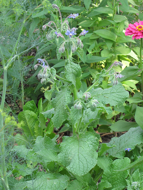 Borage is an annual herb that is commonly grown for its edible qualities, although it does have ornamental merits as well. The crinkled oval grayish green leaves can be harvested at any time in the season. The leaves have a mild taste with a crisp texture and a sweet fragrance.