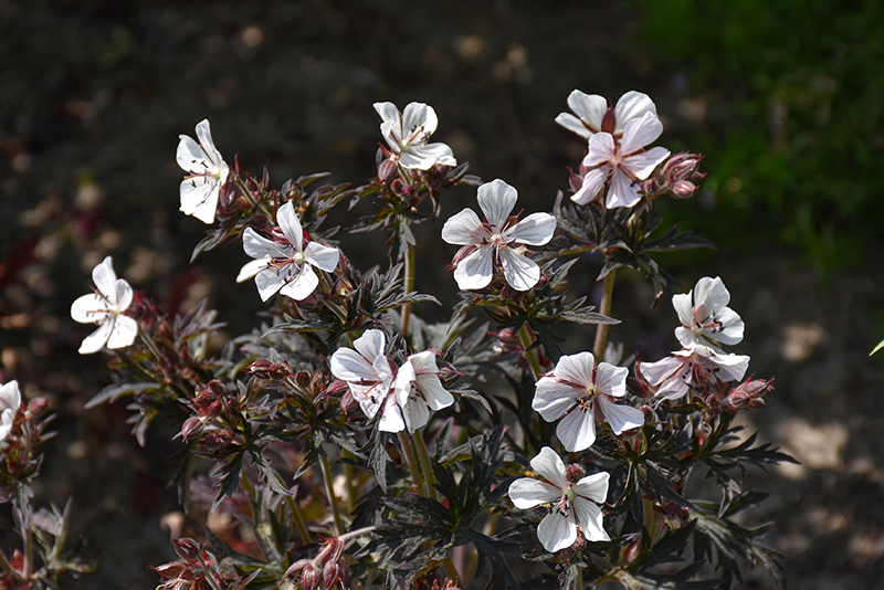 Midnight Ghost Cranesbill has masses of beautiful white star-shaped flowers at the ends of the stems from late spring to mid summer, which emerge from distinctive dark red flower buds, and which are most effective when planted in groupings. Its attractive deeply cut lobed palmate leaves emerge grayish green in spring, turning deep purple in colour with hints of black throughout the season.