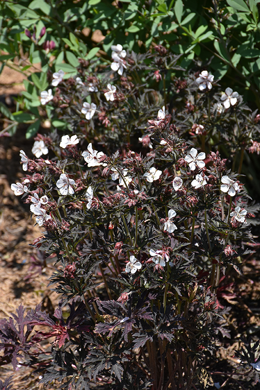Midnight Ghost Cranesbill will grow to be about 15 inches tall at maturity, with a spread of 16 inches. When grown in masses or used as a bedding plant, individual plants should be spaced approximately 14 inches apart. Its foliage tends to remain dense right to the ground, not requiring facer plants in front. It grows at a medium rate, and under ideal conditions can be expected to live for approximately 10 years. As an herbaceous perennial, this plant will usually die back to the crown each winter, and will regrow from the base each spring. Be careful not to disturb the crown in late winter when it may not be readily seen!