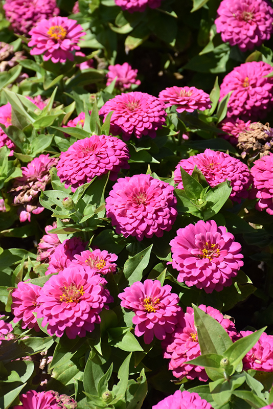 Zesty™ Pink Zinnia features bold double pink round flowers with gold eyes at the ends of the stems from late spring to early fall. The flowers are excellent for cutting. Its pointy leaves remain green in colour throughout the season.