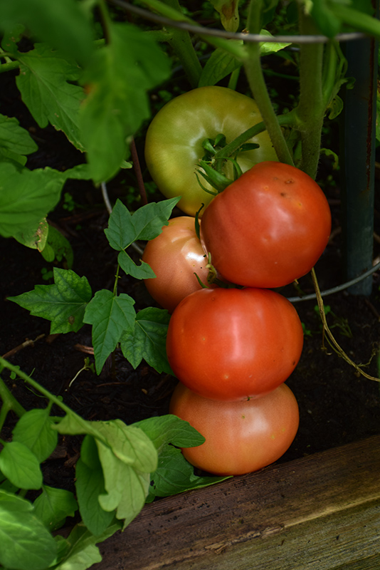 A beautiful vigorous variety that produces high yields all season long; large, red globe shaped fruit with superb flavor are perfect for slicing, sandwiches, roasting and stuffing; crack and disease resistant; staking or caging required