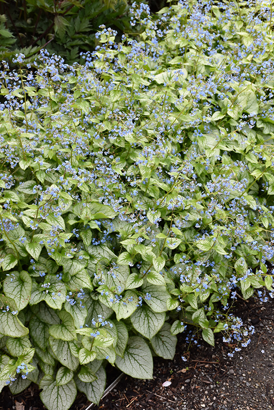 A shade loving variety that features dark green, heart shaped leaves with a silver overlay that resembles lace; baby blue flowers emerge in the spring; fast growing mounded habit, great for use in containers, borders or as groundcover