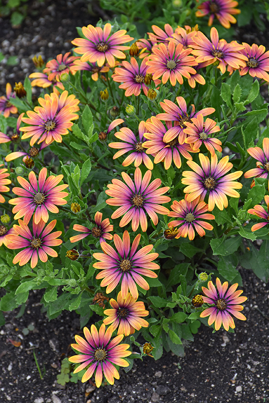 Zion™ Purple Sun African Daisy is clothed in stunning orange daisy flowers with steel blue eyes and a deep purple ring at the ends of the stems from early summer to mid fall. The flowers are excellent for cutting. Its spiny narrow leaves remain green in colour throughout the season.