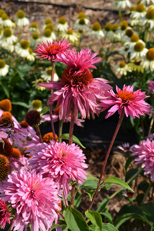 Double Decker Coneflower has masses of beautiful lightly-scented semi-double rose daisy flowers with coppery-bronze eyes at the ends of the stems from mid summer to mid fall, which are most effective when planted in groupings. The flowers are excellent for cutting. Its pointy leaves remain green in colour throughout the season.