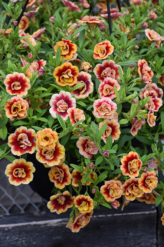 MiniFamous® Neo Double OrangeTastic Calibrachoa is smothered in stunning double peach trumpet-shaped flowers with orange overtones, yellow throats and scarlet centers at the ends of the stems from late spring to early fall. Its small pointy leaves remain green in colour throughout the season.