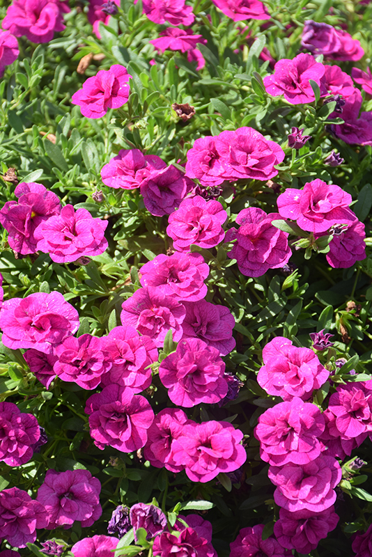 MiniFamous® Neo Double Purple Calibrachoa is smothered in stunning double fuchsia trumpet-shaped flowers at the ends of the stems from late spring to early fall. Its small pointy leaves remain green in colour throughout the season.