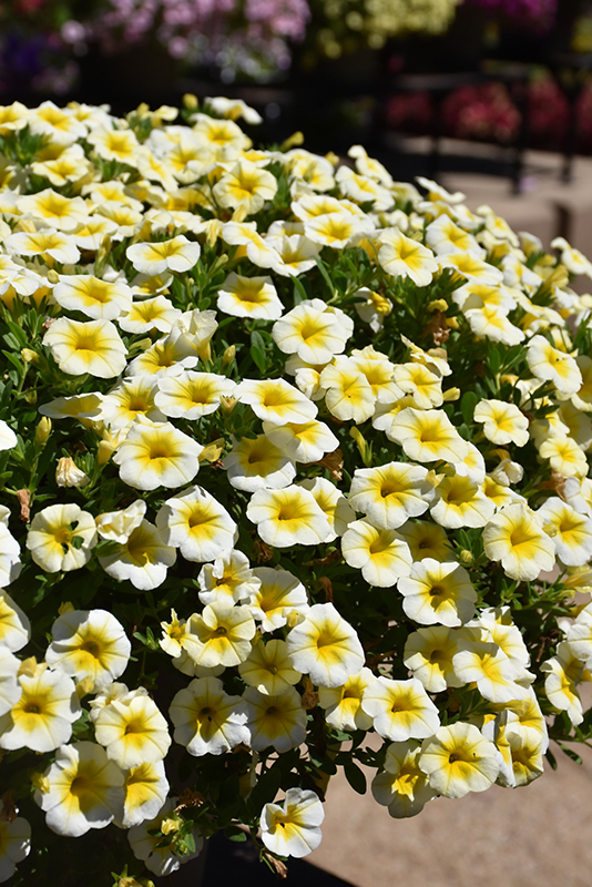 MiniFamous® Uno White Gold Calibrachoa is a fine choice for the garden, but it is also a good selection for planting in outdoor containers and hanging baskets. Because of its trailing habit of growth, it is ideally suited for use as a 'spiller' in the 'spiller-thriller-filler' container combination; plant it near the edges where it can spill gracefully over the pot. Note that when growing plants in outdoor containers and baskets, they may require more frequent waterings than they would in the yard or garden.