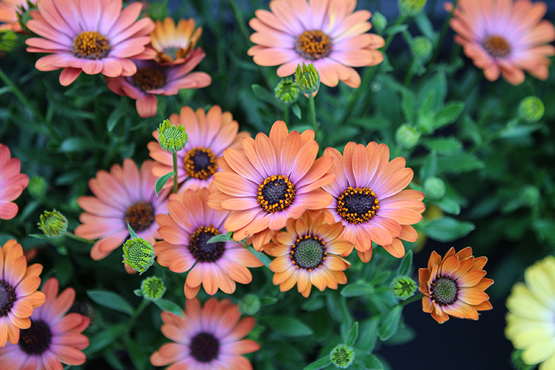 Besties™ Inspiring Orange African Daisy is bathed in stunning orange daisy flowers with deep purple eyes and a shell pink flare at the ends of the stems from late spring to mid fall. The flowers are excellent for cutting. Its spiny narrow leaves remain green in colour throughout the season.